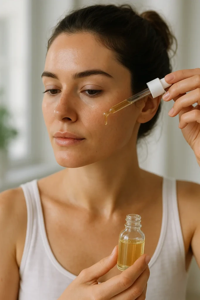 Crée une image ultra-réaliste et photoréaliste d’une femme adulte (25-35 ans), au teint naturel et lumineux, en train d’appliquer délicatement un sérum naturel sur son visage. L’ambiance est moderne, épurée et lumineuse, avec une lumière douce et naturelle qui met en valeur la texture de sa peau et le produit.